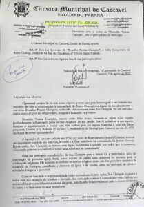 Aprovada por unanimidade a Lei de minha autoria que denomina de “Benedito Pereira Chrispim” o Salão Comunitário do bairro Guarujá.